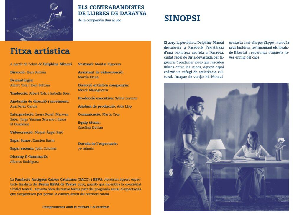 La Fundació Antigues Caixes Catalanes (FACC) i BBVA ofereixen aquest espectacle finalista del Premi BBVA de Teatre 2025, guardó que incentiva la creativitat i l’ofici teatral. Aquesta obra de teatre forma part del programa anual d’espectacles que s’organitzen per portar la cultura arreu del territori català.